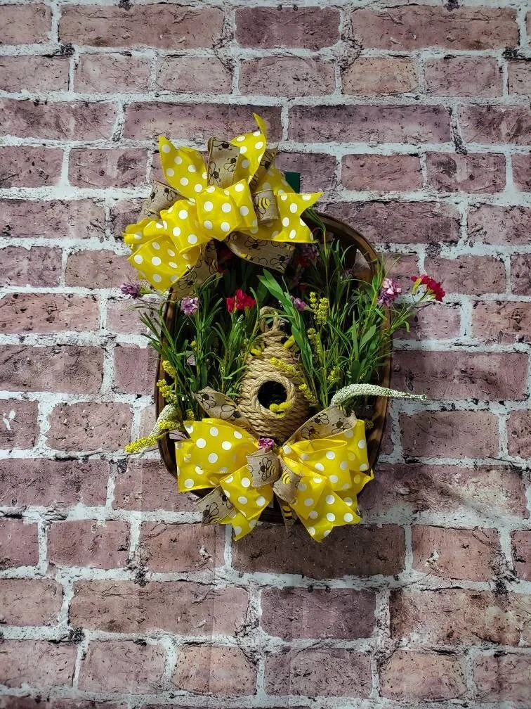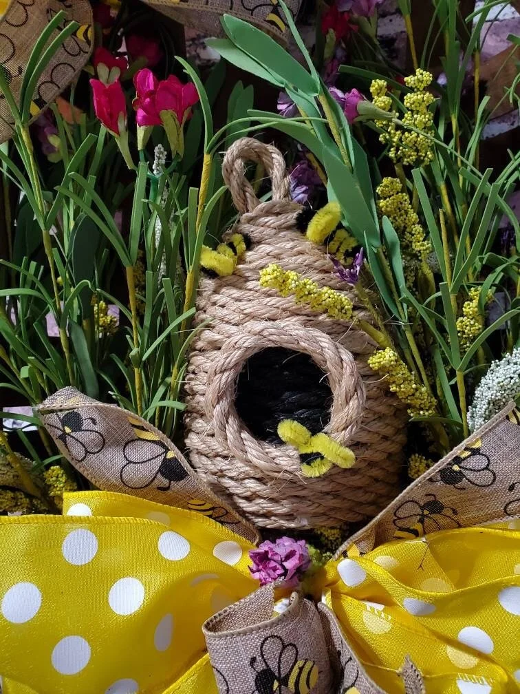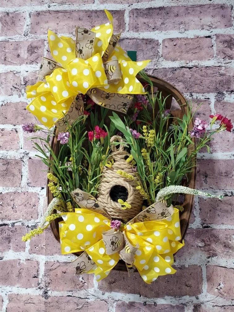 Woodchip tobacco Basket Bumble Bee wreath, front door bee decor, spring wreath, bee wreath, summer wreath