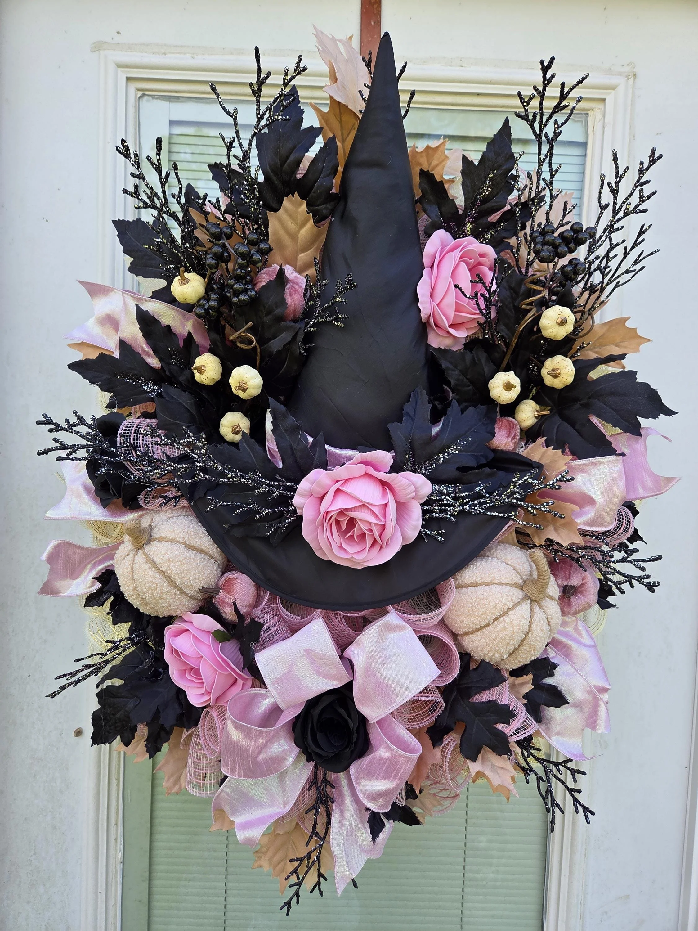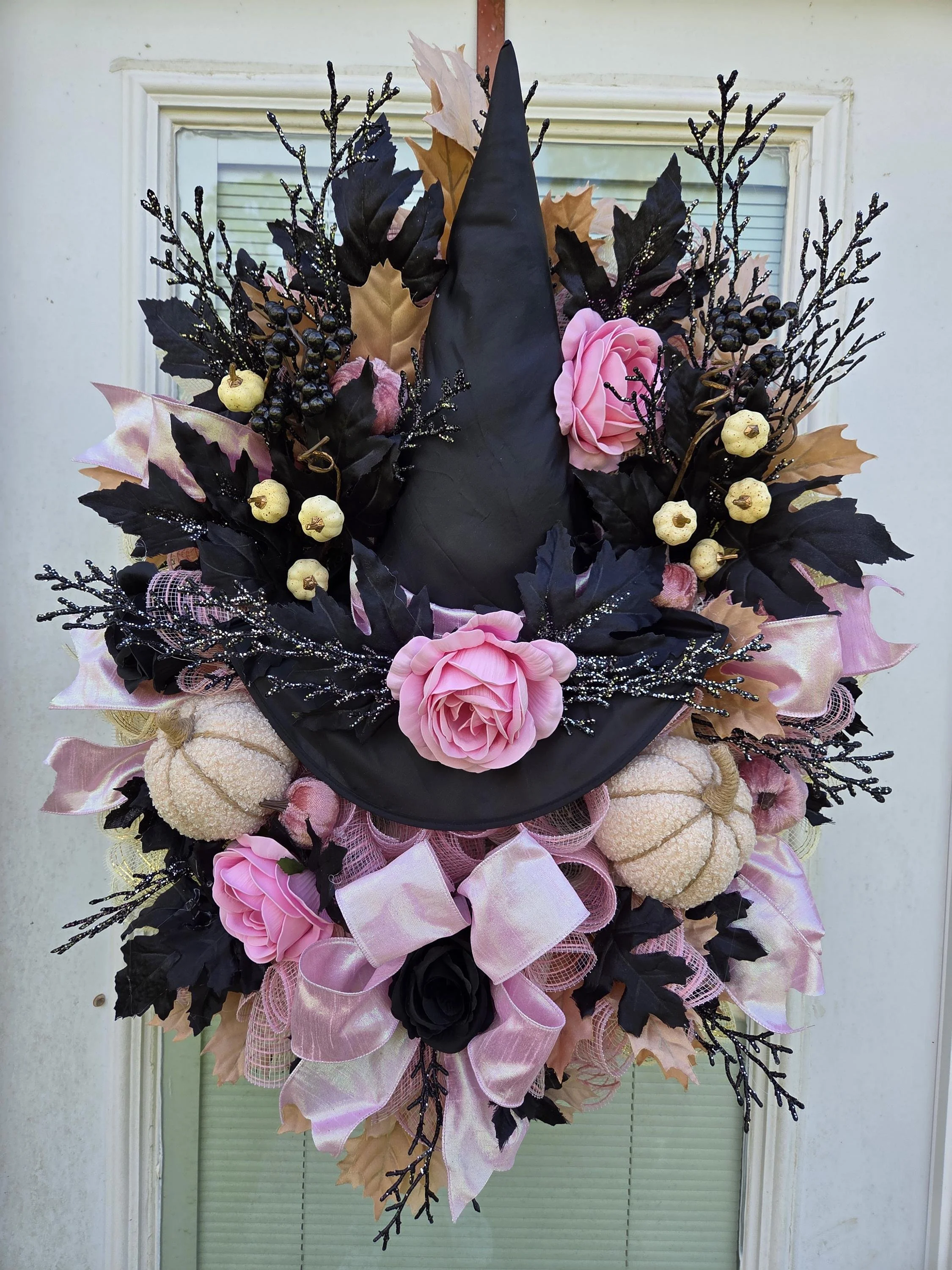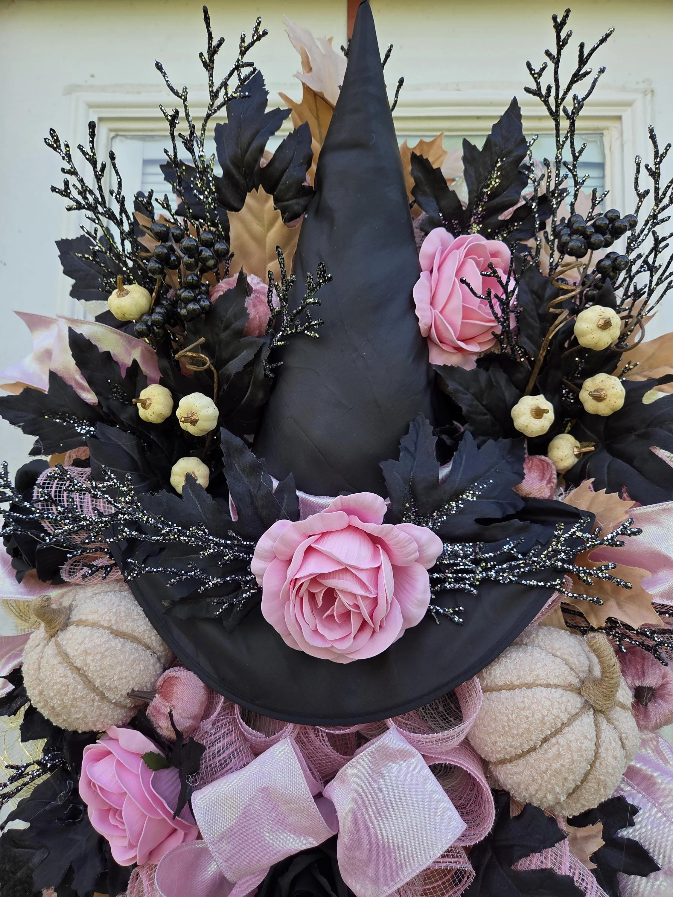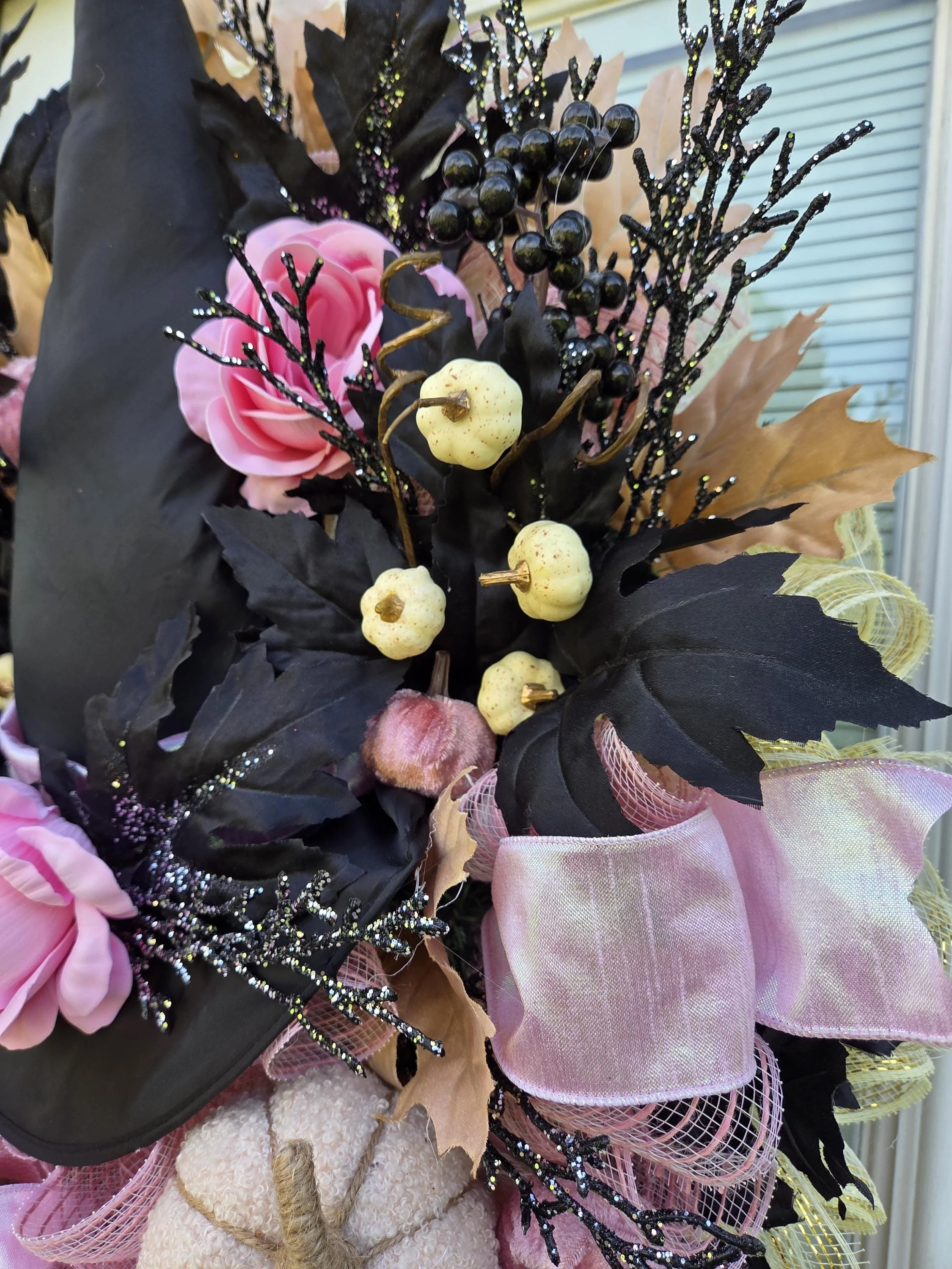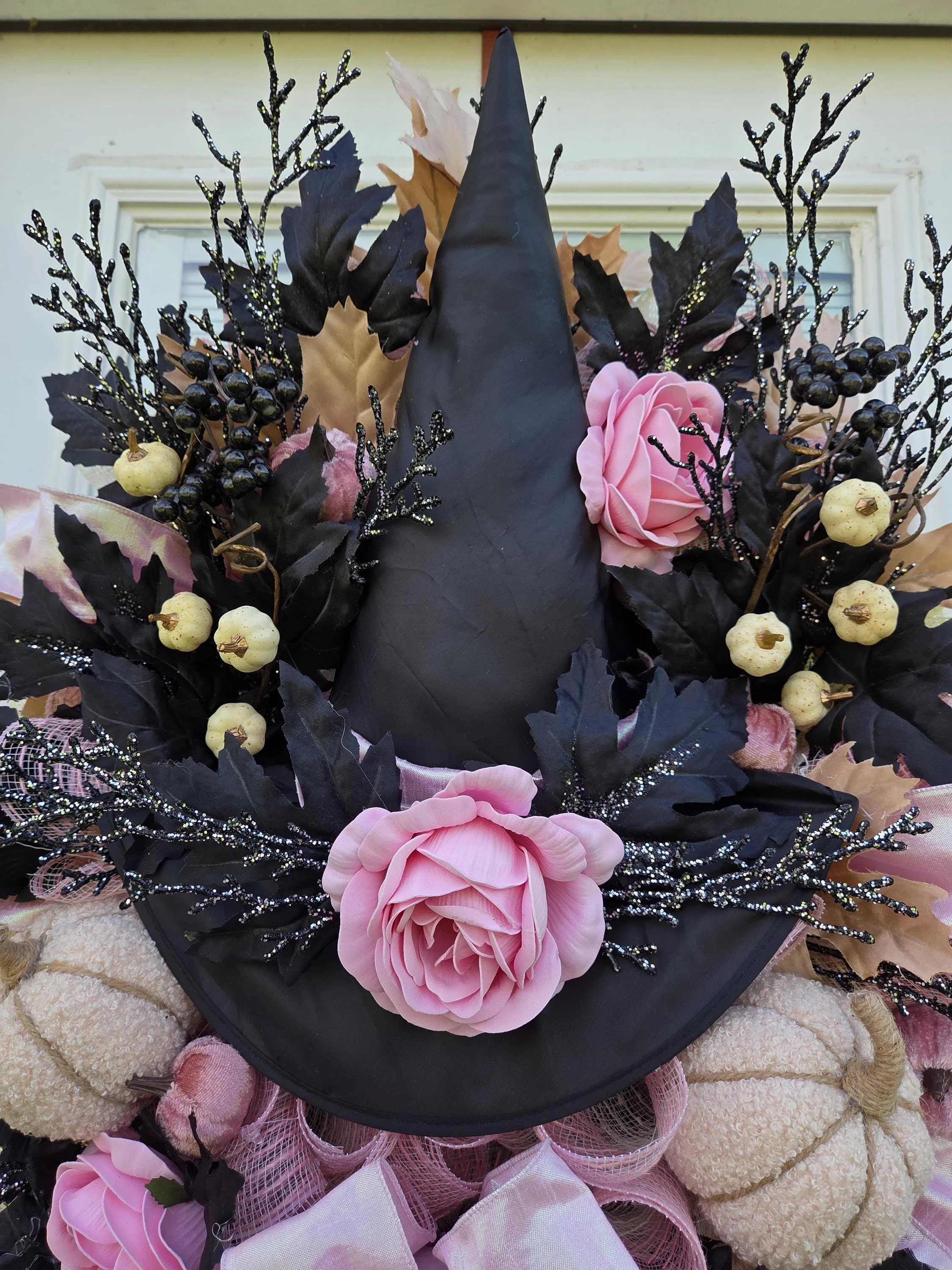 Halloween wreath, Front door wreath, Halloween wreath with witch hat, pink halloween wreath, witch hat wreath, halloween swag